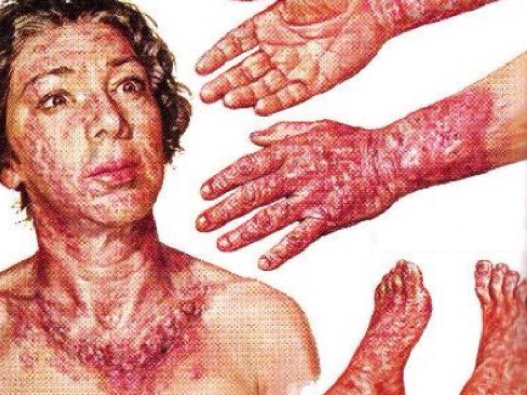 - 1- Dermatit simetrik, qe shkakton lekure te thate, te inflamuar sidomos ne zonat e ekspozuara ne diell. Lekura ne keto zona mund te rrudhet, trashet dhe skuqet.