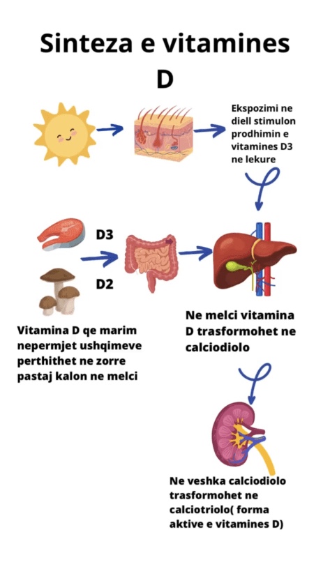– Vitamina D3 (colecalciferol) me e vlefshme per trupin tone e cila gjendet ne produkte si peshku salmon ose veza dhe prodhohet nga ekspozimi ne diell.