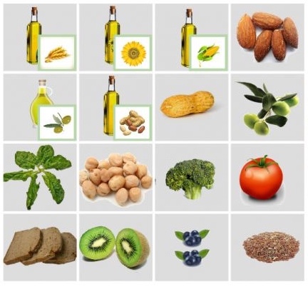 Vaj i embrionit te grurit, vaj luledielli, vaj misri, vaj ulliri, vaj kikirikash, bajame, kikirika, ullinj, spinaq, qiqra, brokoli, domate, buke integrale, kiwi, boronice, oriz integral, veze, avocado, salmon, fara luledielli.